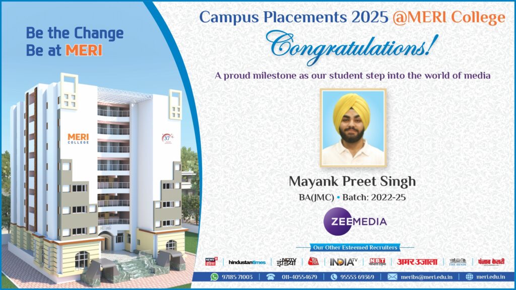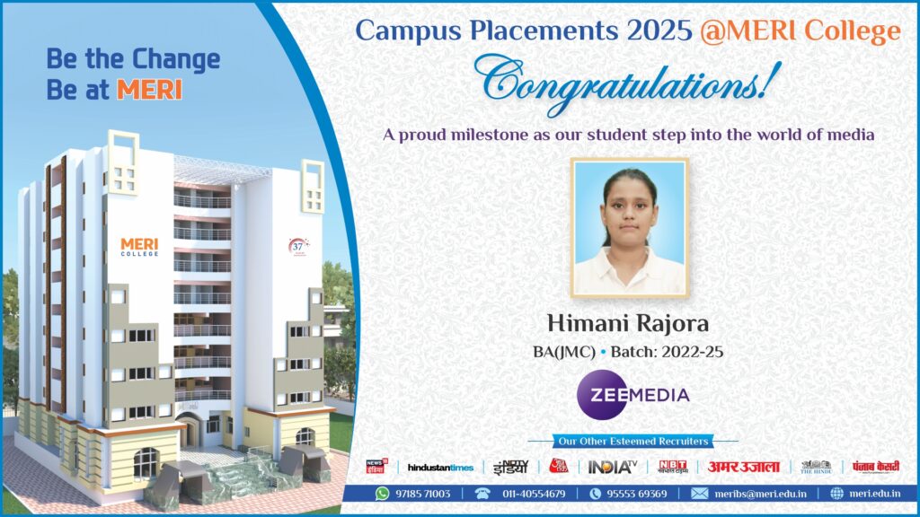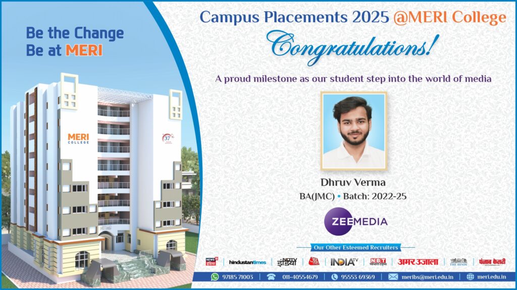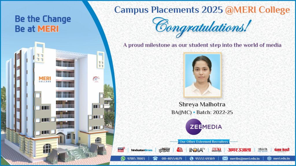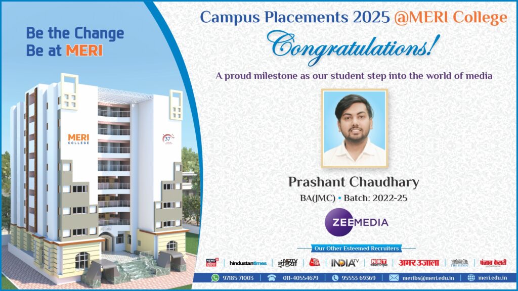 The placement cell of MERI College is headed by senior HR personnel. The objective of the cell is to provide placement to the students. The dedicated placement cell for media students plays a crucial role in bridging the gap between academic learning and professional careers. This cell focuses on equipping students with the skills necessary to succeed in the competitive media industry. It provides personalized career counseling, organizes workshops, and invites industry experts to give insights into current trends and practices. The placement cell also facilitates internships, which are essential for hands-on experience, enabling students to develop a real-world understanding of journalism.